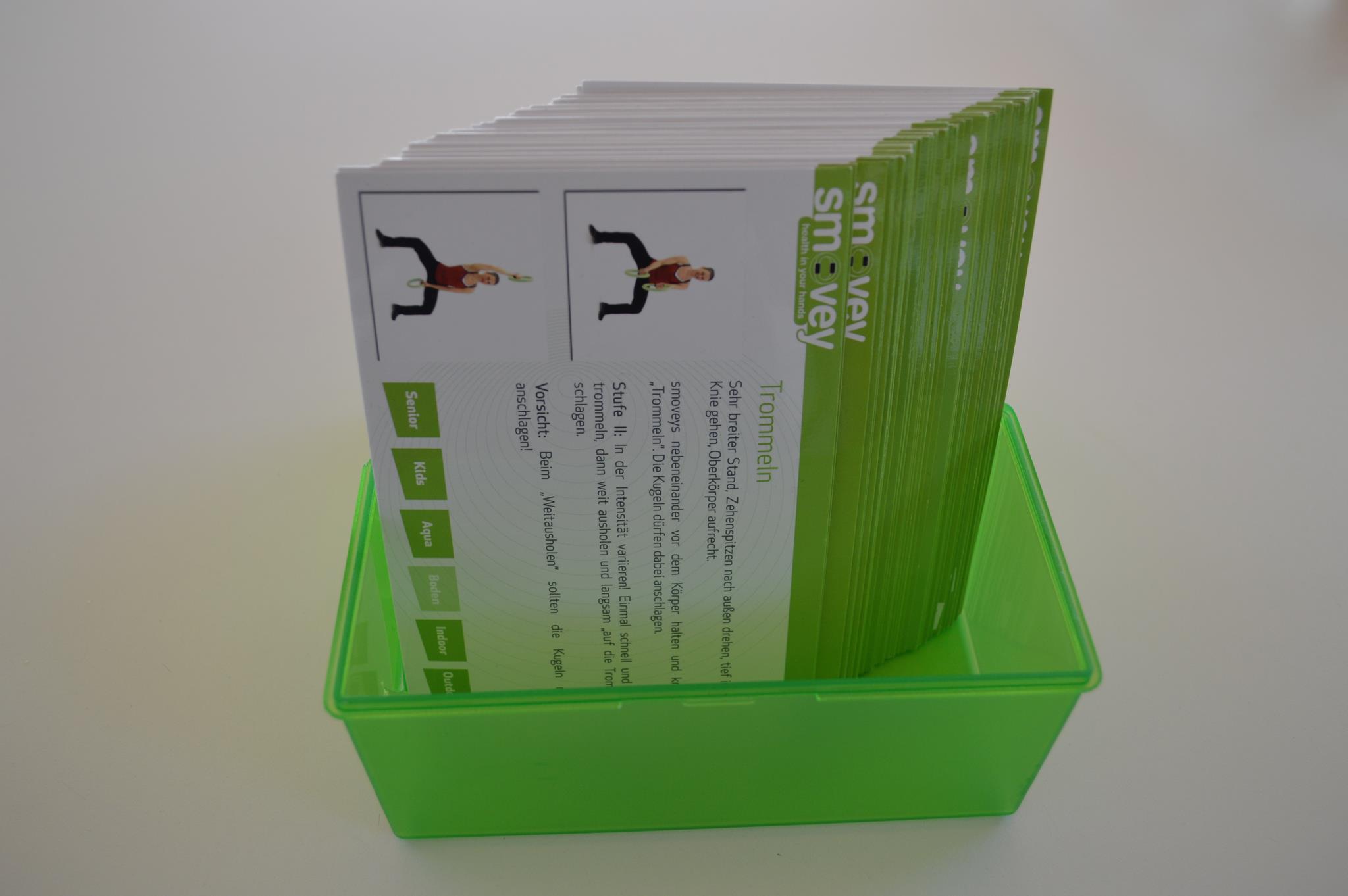 Das Basic-Set und besteht aus 63 Karten mit Übungsanleitungen. Pro Karte ist eine Übung beschrieben, die mit Fotos ergänzt ist. So sieht man auf dem ersten Blick, wo diese Übung durchführbar ist, da die Übungen in 6 Kategorien unterteilt sind - Senior, Kids, Aqua, Boden, Indoor, Outdoor.